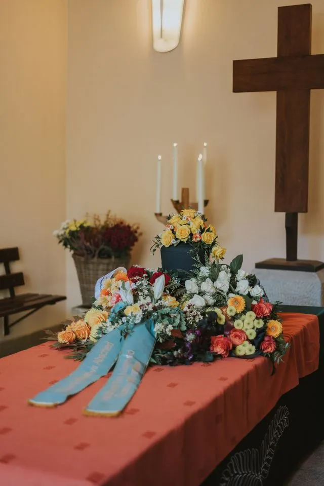 Sarg mit floralem Blumenschmuck in der Trauerhalle als Abschied bei einer Erdbestattung