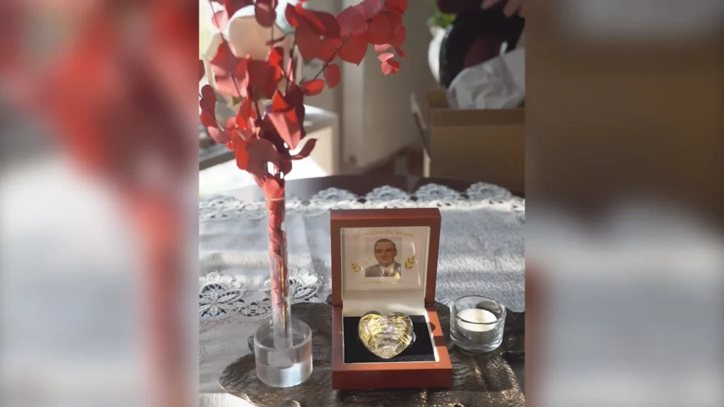 Holzurne mit handgemaltem Mohnblumenmotiv und floralem Urnenschmuck bei einer Trauerfeier einer Feuerbestattung